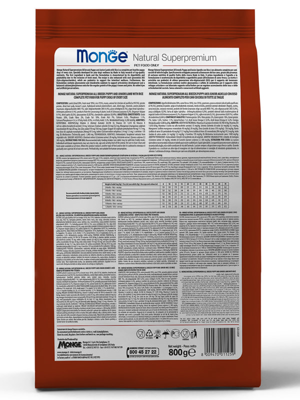 Monge (Монж) Dog Speciality Line Puppy & Junior All Breeds сухой корм из мяса ягнёнка и риса для щенков всех пород 800 г.