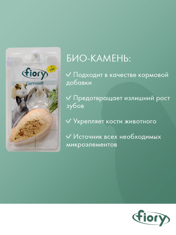 FIORY био-камень для грызунов в форме моркови.Минеральный био-камень – важная добавка для всех грызунов! Минеральный био-камень помогает питомцам равномерно стачивать постоянно растущие зубы. В состав био-камня входят 12 различных минералов, которые способствуют укреплению костей и благотворно влияют на организм питомца в целом , такие как кальций, фосфор, натрий, железо, цинк, магний, селен и др. Селен - редкий и ценный антиоксидант, который борется со свободными радикалами, поддерживая антиоксидантную защиту, а кристаллы соли в составе повышают вкусовую привлекательность. Удобная форма моркови не только сделает процесс стачивания зубов простым и удобным для грызуна, но и украсит клетку вашего любимца. Степень твердости 50 единиц (параметр SHORE C).
