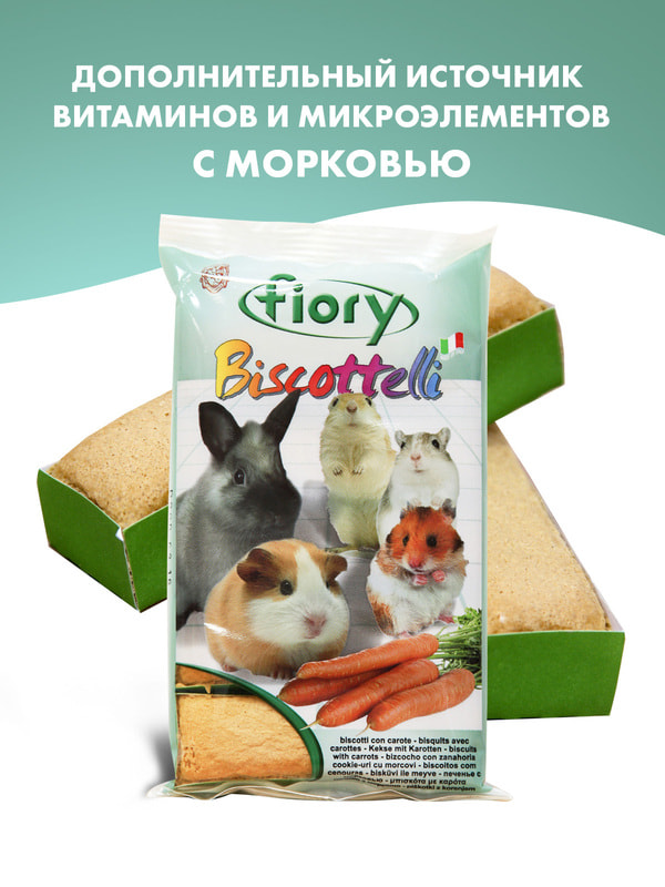 FIORY бисквиты для грызунов с морковью. В состав бисквитов входит морковь , которая не оставит вашего грызуна равнодушным. Морковь богата каротином, витамином А и С. Подарите своему питомцу питательное и полезное лакомство.Сделано в Италии.