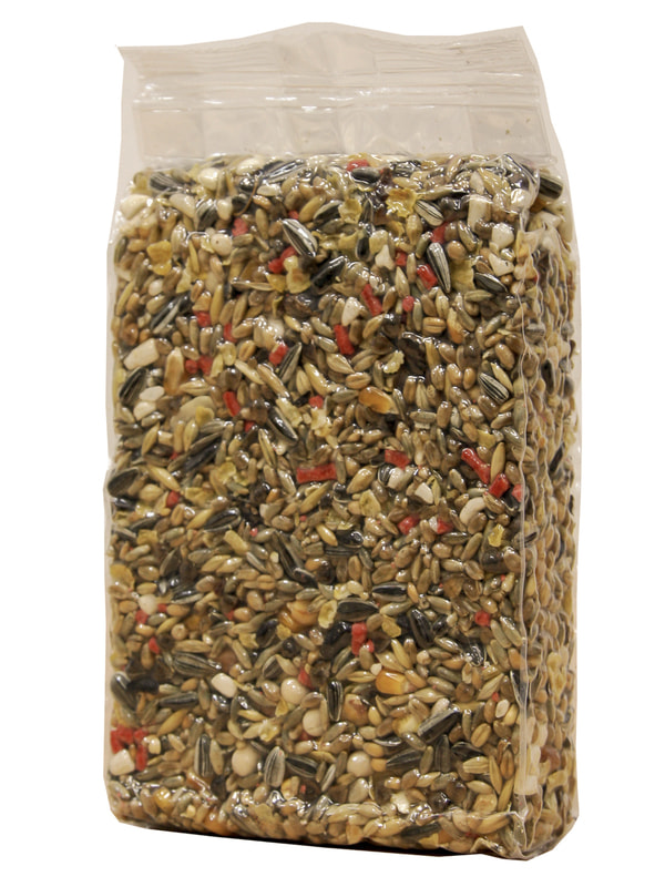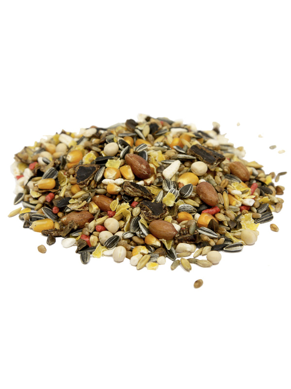 Ингредиенты: пшеница, кукуруза цельная, рожь очищенная, горох очищенный, подсолнечник полосатый 5%, арахис очищенный 5%, плоды рожкового дерева 5%, овес неочищенный, гречиха, кукурузные хлопья, красные гранулы (пекарные продукты, злаки и зерновые продукты, мед 10%, масла, экстракт Юкки Schidigera, красители и консерванты, одобренные ЕС) 4,1%, ячмень неочищенный, рис воздушный.