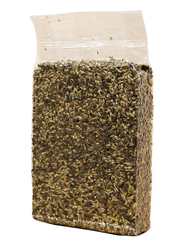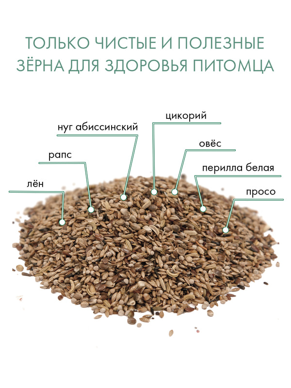 Семена: канареечник, лен, конопля, перилла, абессинский нуг, мак, рапс, морковь, петрушка, латук белый, фенхель, анис, цикорий, овес очищенный, просо белое.