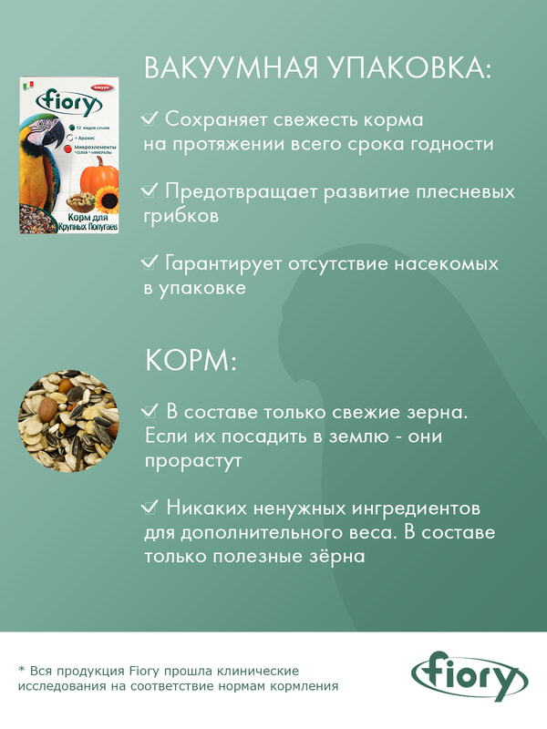 Крупным попугаям необходим особый уход, их организм нуждается не только во вкусной, но и полезной пище. Смесь содержит одиннадцать различных видов семян, среди которых есть и тыквенные семена.