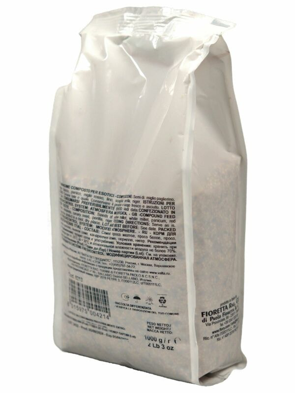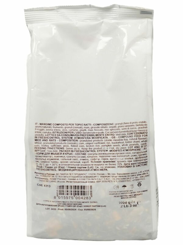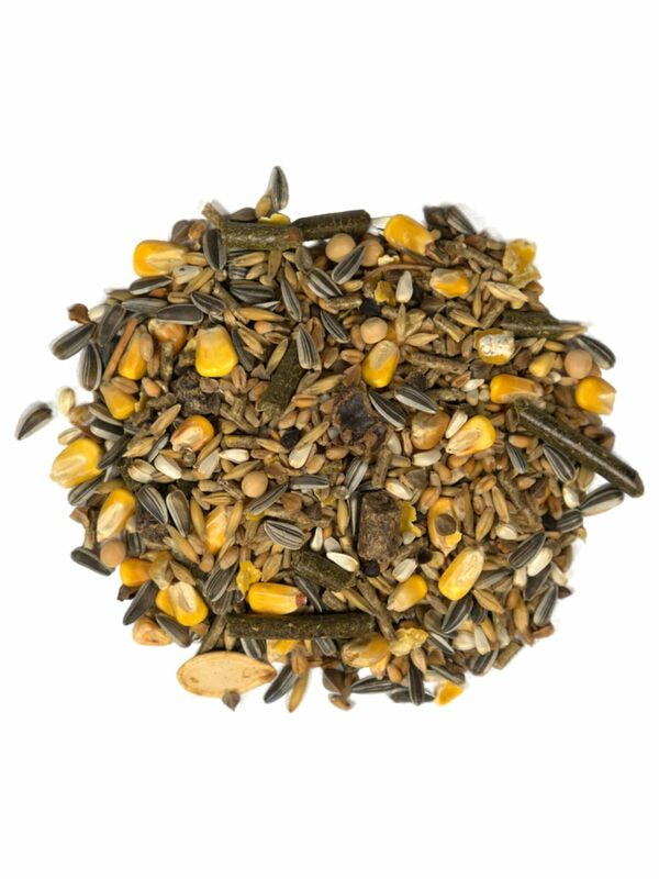 Корм содержит различные виды злаков, гранулы сена, семена тыквы, мангольд, семена подсолнечника, сафлор, арахис, кэроб.