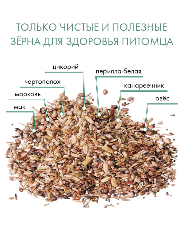Семена: канареечник, конопля, чертополох 10%, овес, лён, гранулы (пекарные продукты, злаки и зерновые продукты, мёд 10%, масла, экстракт юкки Шидигера, красители и консерванты, одобренные ЕС) 4,5%; семена: морковь, перилла 4,1%, мак, цикорий, анис, абессинский нуг, злаки.