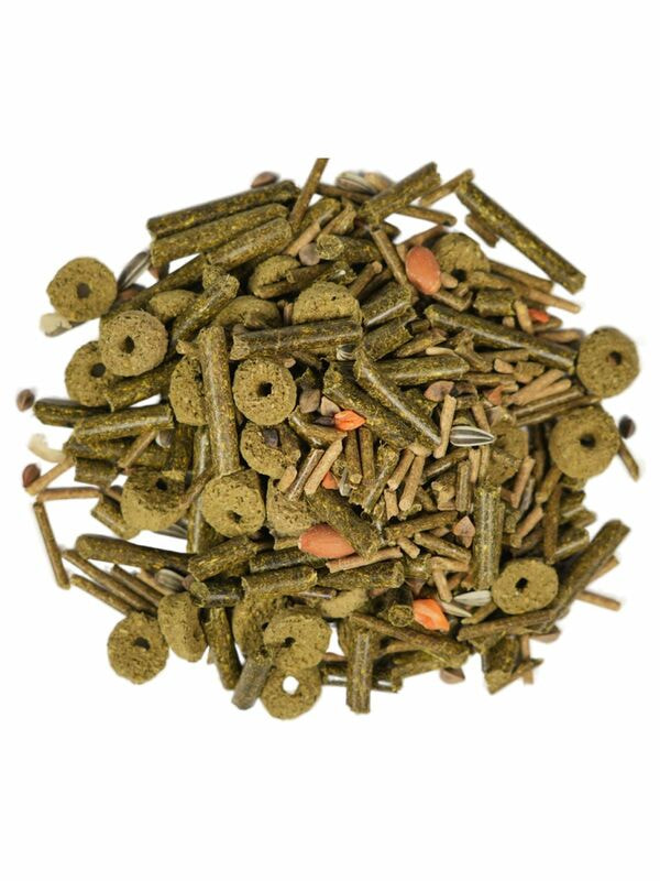Корм содержит различные виды злаков, гранулы сена, арахис, дегидрированную морковь, семена подсолнечника, кэроб.