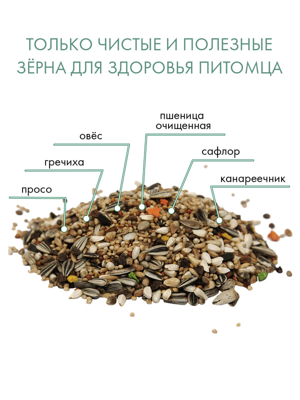 Зерновые продукты; семена: подсолнечник полосатый, гречка, канареечник, конопля, пекарные продукты.