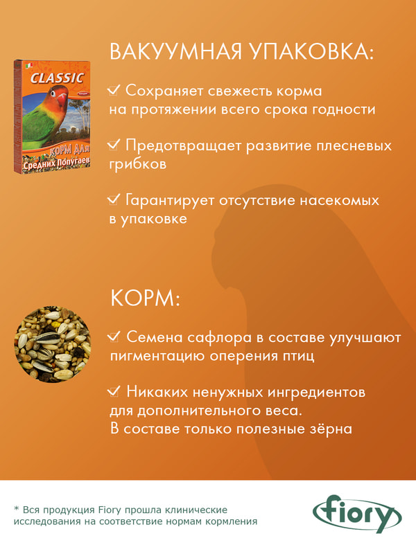 FIORY корм для средних попугаев Classic 650 гКлассическая смесь для средних попугаев. В состав входят злаковые, семена полосатого подсолнечника, гречиха, семена каеареечника, семена конопли, пекарные продукты. Корм упакован в вакуум.