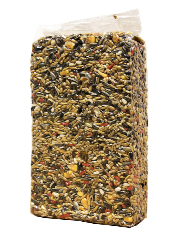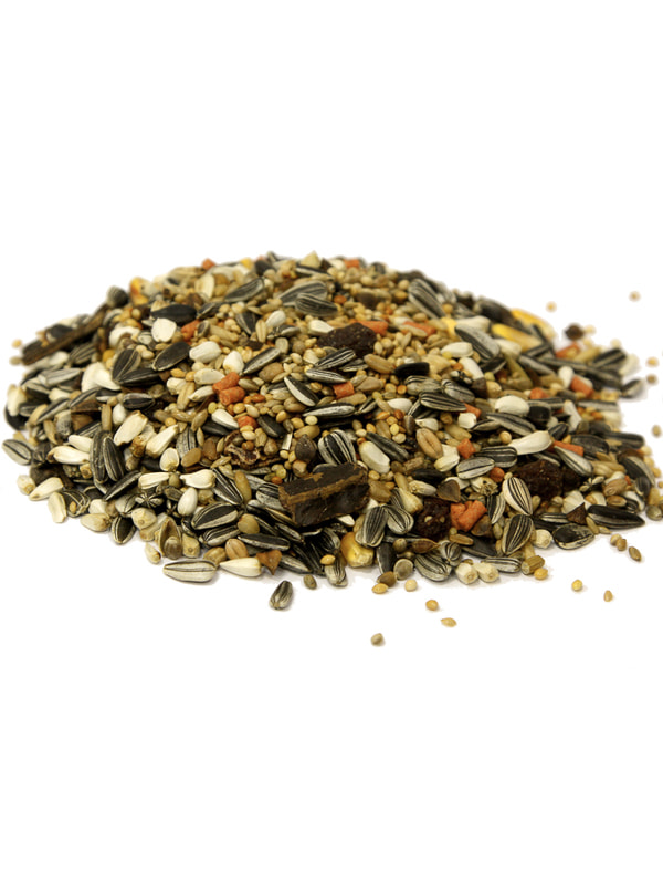 Семена: подсолнечника полосатые, просо желтое, сафлор, просо белое, канареечник, пшеница, просо красное, кукуруза, гречиха, очищенный овес, гранулы (пекарные продукты, злаки и зерновые продукты, мёд 10%, масла, экстракт юкки Шидигера, красители и консерванты, одобренные ЕС) 4,1%, изюм 4,1%, бобы рожкового дерева, конопляное семя.