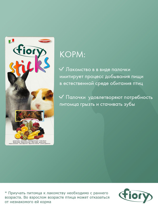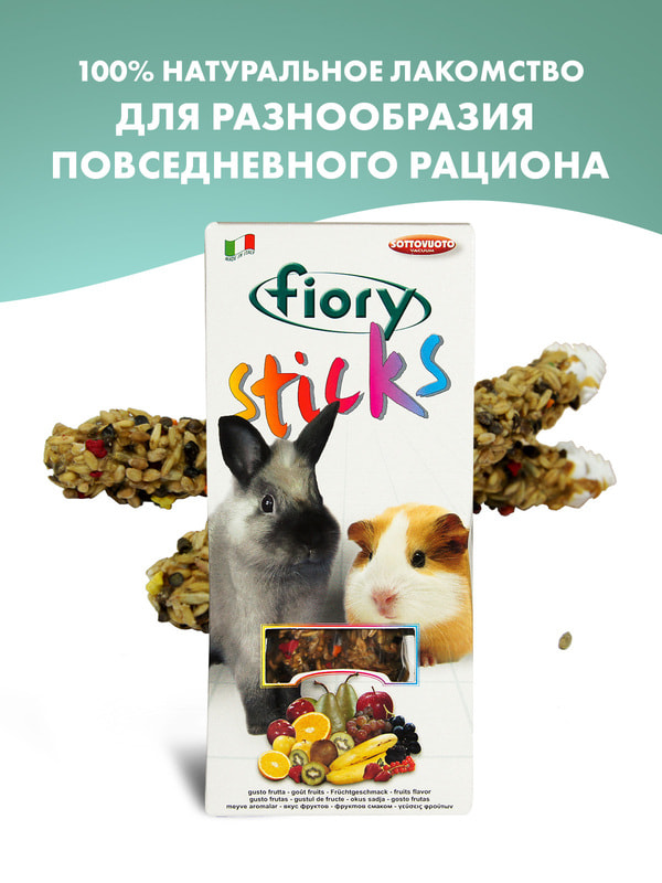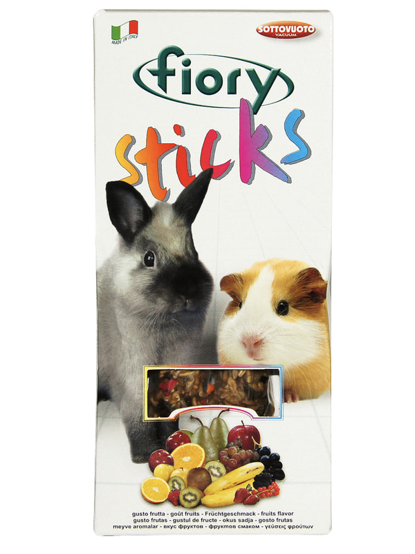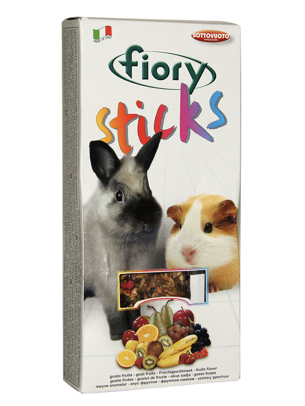 FIORY палочки для морских свинок с фруктами. Палочки содержат вкусные и полезные смена и фрукты, которые считаются настоящим лакомством для морских свинок. Клейкий элемент особенно вкусен, и грызунам легко грызть его: он позволяет разгрызать семена, не раскалывая их на кусочки и не разбрасывая крошки по полу клетки.