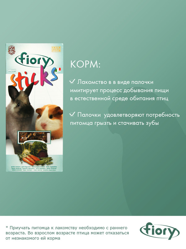 FIORY палочки для морских свинок с овощами Палочки с десятью различными элементами, обогащены вкусными высушенными хлопьями свеклы, что делает их идеальной добавкой к рациону наших маленьких друзей. Клейкий элемент особенно вкусен, позволяет грызунам грызть семена, не раскалывая их на кусочки и не разбрасывая крошки по дну клетки. Поскольку продукт отличается высоким содержанием белка, им не следует злоупотреблять. Как и все подобного рода дополнительное питание, палочки считаются лакомством и являются добавкой к обычному рациону. Можно стимулировать интерес ваших любимцев к продукту, предлагая им различные его вкусы из этой линейки: фрукты, мед, земляной орех и фундук.