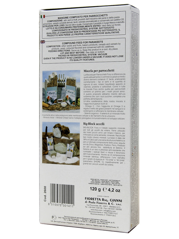 FIORY палочки для средних попугаев с фруктами. Палочки с десятью различными элементами. Фрукты богаты клетчаткой, белками и жирами, а также витаминами. Клейкий элемент особенно вкусен, позволяет птицам легко его клевать, не раскалывая их на части и не разбрасывая крошки по дну клетки. Поскольку продукт отличается высоким содержанием белка, им не следует злоупотреблять. Как и все подобного рода дополнительное питание, палочки считаются лакомством и являются добавкой к обычному рациону.