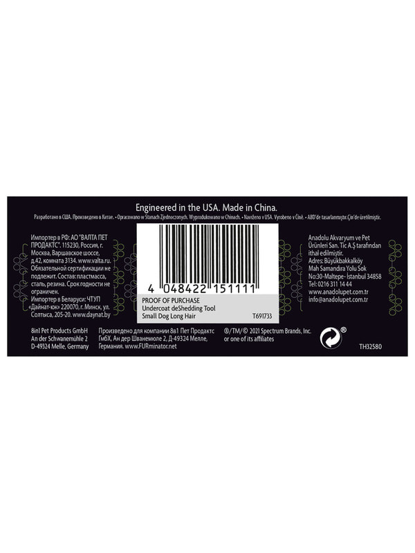 Инструмент FURminator (Фурминатор) S - 39 мм (длина рабочей поверхности).Отлично подойдет для мелких собак (4,5- 9 кг) с длинной шерстью (более 5 см.). Уникальное лезвие захватывает и вытаскивает мертвые волоски подшерстка до их выпадения, сокращая линьку до 90%. Инструмент экономит ваше время, сохраняет здоровье кожи и шерсти, не повреждает остевой волос. Вы забудете о выпавшей шерсти на полу, одежде и мебели. Кнопка самоочистки легко сбрасывает шерсть с инструмента. Защелкните ее для защиты в процессе хранения. Защитные края предупреждают давление на кожу.
