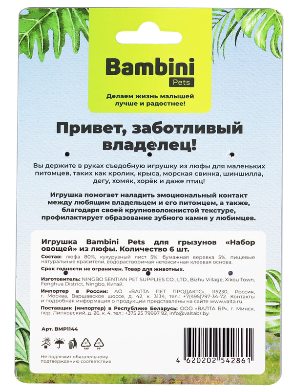 Bambini Pets Игрушка Bambini Pets для грызунов "Набор овощей" из люфы. Количество 6 шт