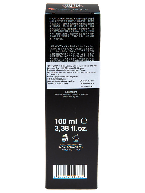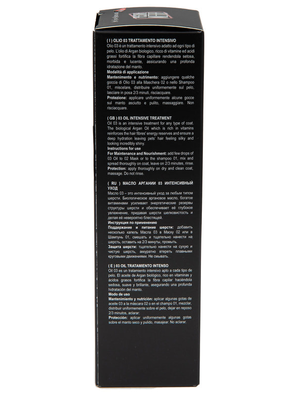 Масло 03 – это интенсивный уход за любым типом шерсти. Биологическое аргановое масло, богатое витаминами усиливает энергетические резервы структуры шерсти и обеспечивает её глубокое увлажнение, придавая шерсти шелковистость и делая её невероятно блестящей.