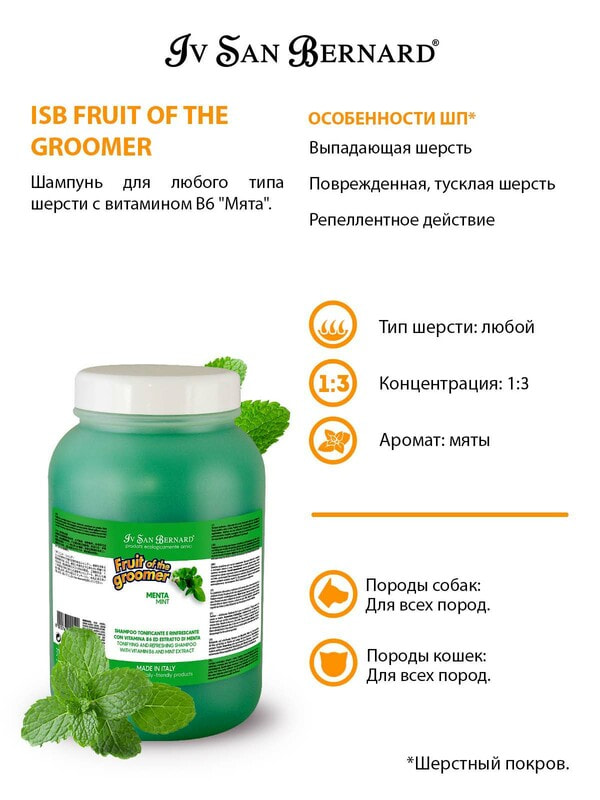 Шампунь Iv San Bernard Fruit of the Groomer Mint для любого вида шерсти с витамином В6 3,25 л