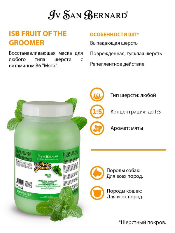 Косметика и средства по уходу Iv San Bernard ISB Fruit of the Groomer Mint Восстанавливающая маска для любого типа шерсти с витамином В6 3 л