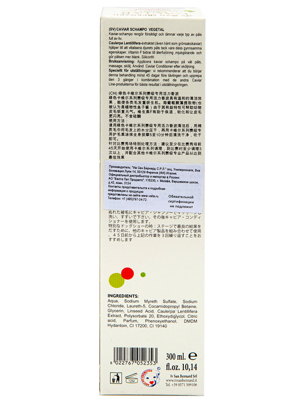 Шампунь деликатно очищает и заряжает энергией любой тип шерсти. Экстракт морской водоросли Каулерпы (известной, как «зеленая икра») помогает ревитализировать (восстанавливать) шерстный покров животного благодаря своим полезным свойствам. Витамин F способствует увлажнению и смягчению кожи, придает блеск шерсти. Средство не содержит силикона. Способ применения: Нанести шампунь на влажную шерсть, помассировать, смыть. Затем применить бальзам-кондиционер "Зеленая икра". Подготовка к выставке: для получения отличных результатов в ринге рекомендуется начать применение как минимум за 45 дней до выставки и повторить 3 раза в сочетании с другими продуктами линии ISB Green Caviar.