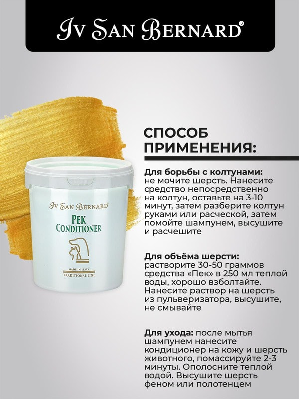 Способ применения: нанести средство на 3 мин, разобрать колтун руками или расческой, при необходимости надрезать ножницами по росту шерсти, вымыть шампунем, сушить и расчесать. Подготовка к выставке: растворить 30-50 гр. средства «ПЕК» в 250 мл. теплой воды. Нанести раствор на шерсть из пульверизатора, сушить, не смывать.