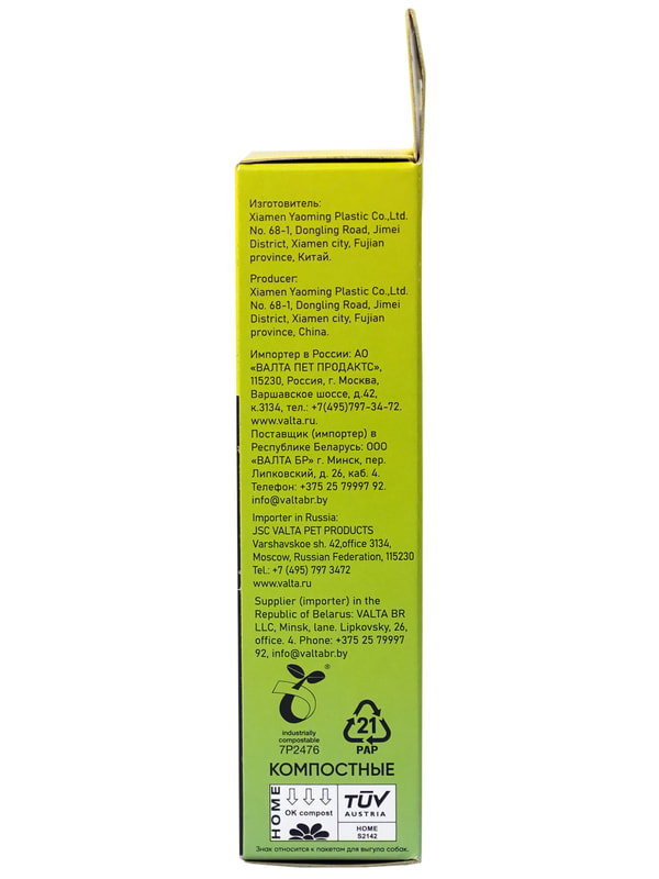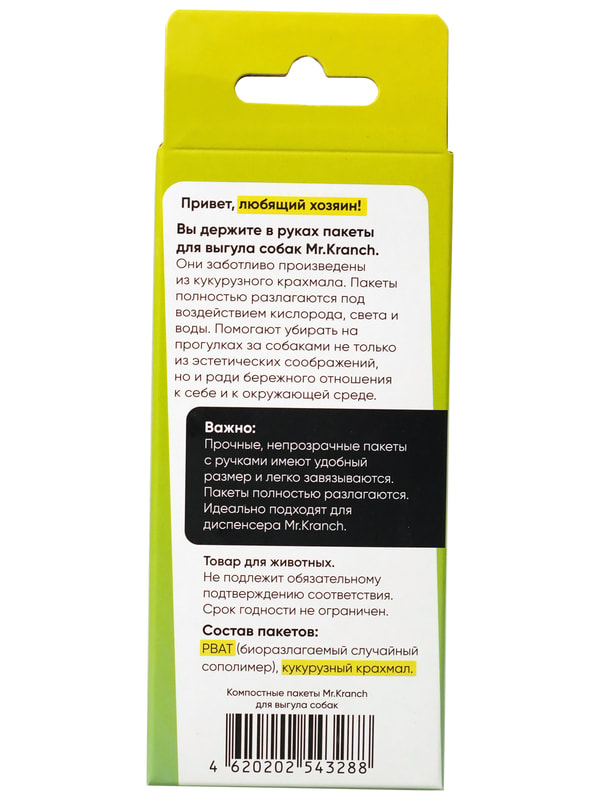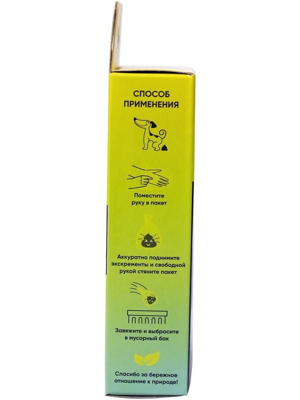 Произведены из кукурузного крахмала. Пакеты полностью разлагаются под воздействием кислорода, света и воды в течение 30-70 дней. Помогают убирать на прогулках за собаками не только из эстетических соображений, но и ради бережного отношения к себе и к окружающей среде.