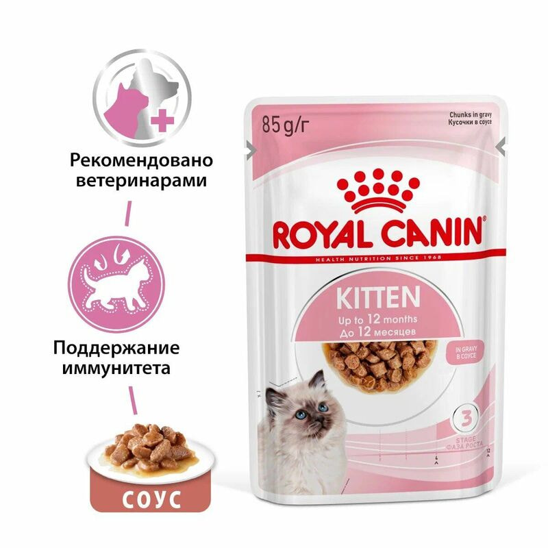 Формула влажного продукта ROYAL CANIN® Kitten (КИТТЕН), мелкие кусочки в соусе, поддерживает иммунитет , соответствует инстинктивным предпочтениям котят, а также способствует развитию мозга и зрения котят во время второй фазы роста.