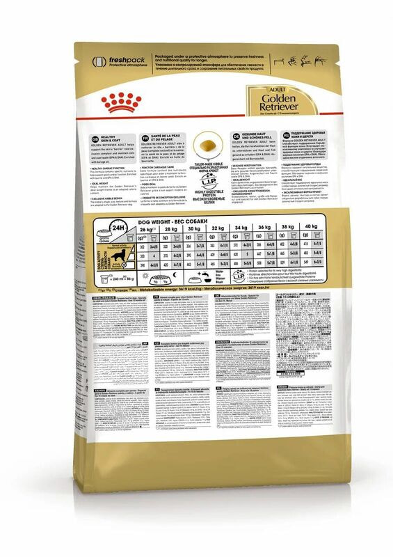 Формула сухого продукта ROYAL CANIN® Golden Retriever Adult (ЗОЛОТИСТЫЙ (ГОЛДЕН) РЕТРИВЕР ЭДАЛТ) поддерживает здоровье кожи и красоту шерсти, помогает защите организма на клеточном уровне и сохранению оптимального веса, а также поддерживает сердечную функцию собаки.