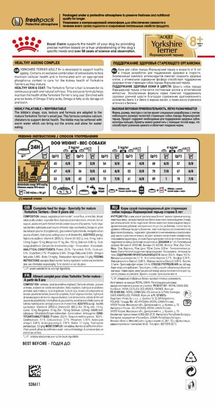 ROYAL CANIN® Yorkshire Terrier Adult 8+ years (ЙОРКШИРСКИЙ ТЕРЬЕР ЭДАЛТ 8+ ЛЕТ) содержит жирные кислоты Омега-3 (EPA и DHA и комплекс антиоксидантов) для поддержания здоровья и жизненной энергии собак в годы старения.