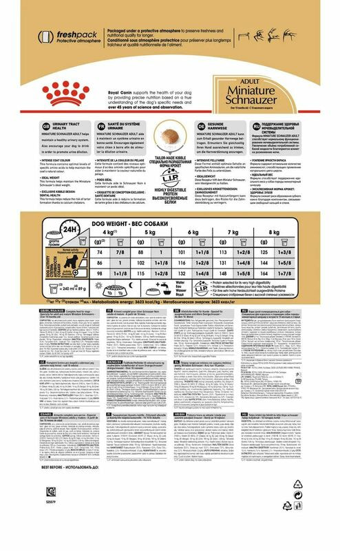 ROYAL CANIN® Miniature Schnauzer Adult (МИНИАТЮРНЫЙ ШНАУЦЕР ЭДАЛТ) содержит оптимальное количество аминокислот, L-тирозина и меди, которые помогают раскрыть яркость естественного окраса шерсти вашего миниатюрного шнауцера.