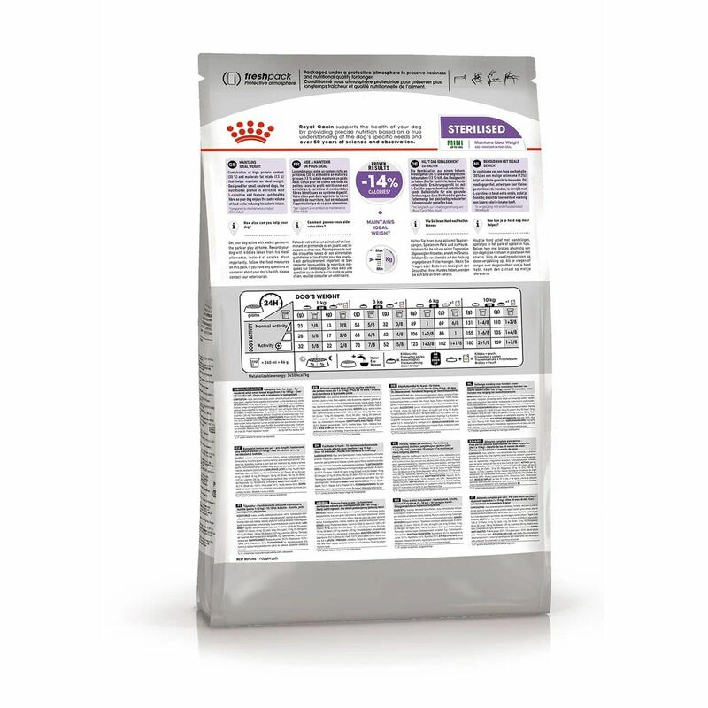 Формула сухого продукта ROYAL CANIN® Mini Sterilised (МИНИ СТЕРИЛАЙЗД) поддерживает оптимальный вес, здоровье мочевыделительной системы и здоровье зубов стерилизованных собак мелких размеров.