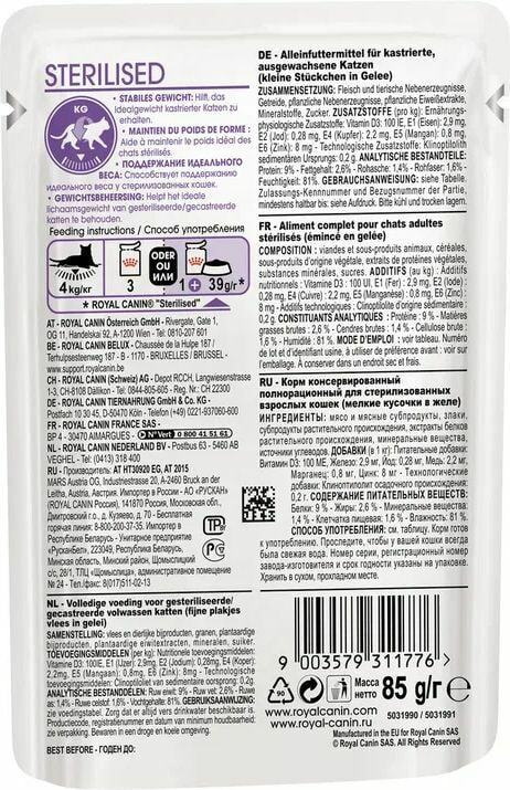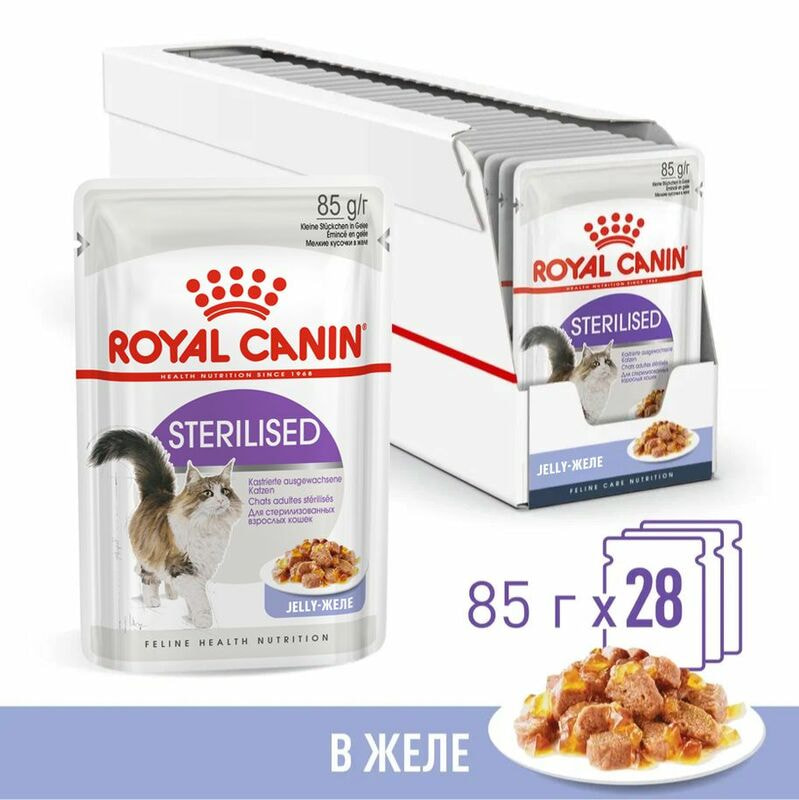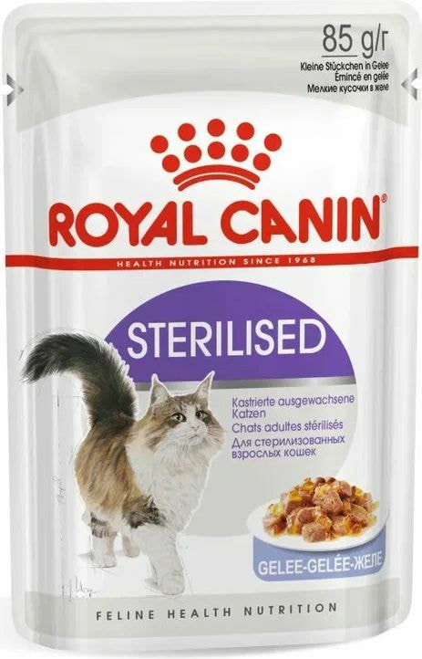 Корм влажный полнорационный для кошек - Специально для стерилизованных кошек старше 1 года STERILISED (СТЕРИЛАЙЗД) ROYAL CANIN®, мелкие кусочки в желе, подходящий для стерилизованных кошек старше 1 года, специально разработан c учетом потребностей вашей кошки в питательных веществах.