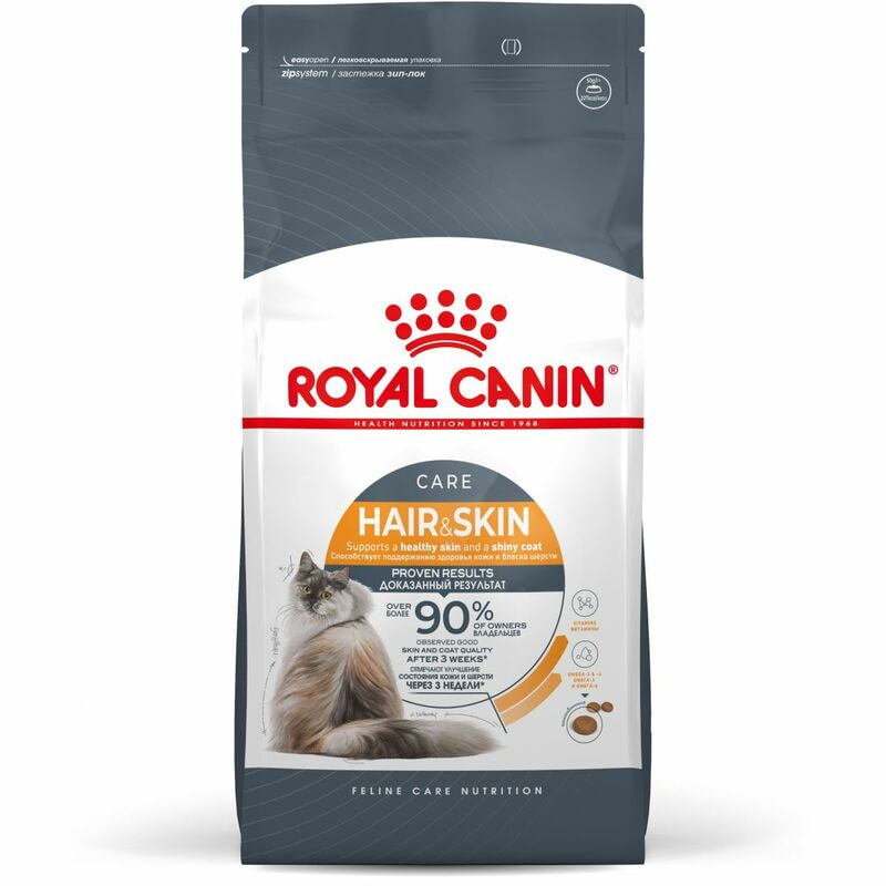 ROYAL CANIN® Hair & Skin Care (ХЭЙР ЭНД СКИН КЭА) содержит комбинацию витаминов группы В, серосодержащих аминокислот, цинка и меди, что поддерживают барьерную функцию кожи, а также являются строительным материалом для шерсти кошек.