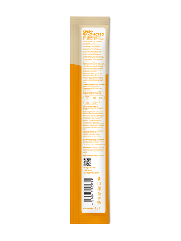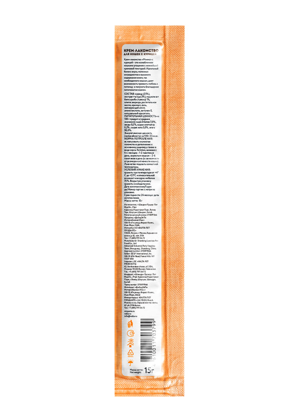 Крем-лакомство «Мнямс» с курицей – это изысканное угощение с нежнейшей кремовой консистенцией. Утонченный вкус приводит кошек в восторг, а яркие эмоции довольных любимцев при кормлении с рук дарят хозяевам ощущение полного счастья. Подается как порционное угощение, или добавляется в виде аппетитного соуса к основному рациону для обогащения вкуса привычных блюд. Изготовлено по новейшей японской технологии и соответствует мировым стандартам качества.