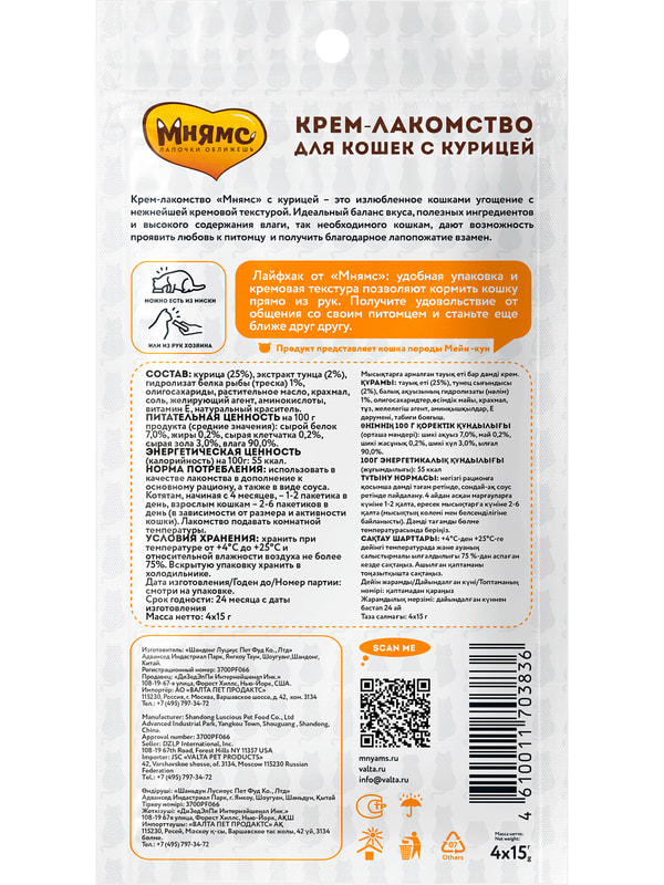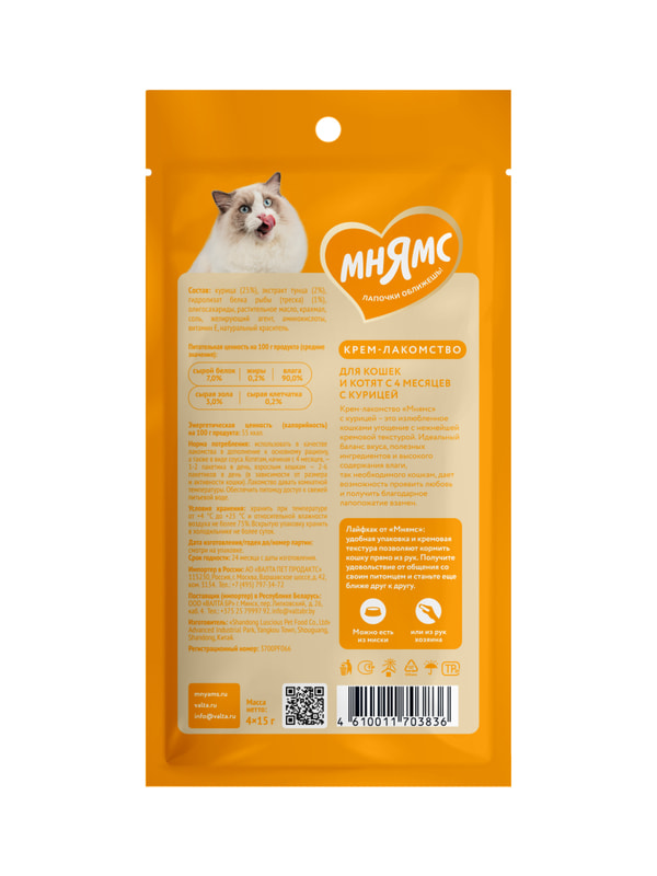 Крем-лакомство «Мнямс» с курицей – это изысканное угощение с нежнейшей кремовой консистенцией. Утонченный вкус приводит кошек в восторг, а яркие эмоции довольных любимцев при кормлении с рук дарят хозяевам ощущение полного счастья. Подается как порционное угощение, или добавляется в виде аппетитного соуса к основному рациону для обогащения вкуса привычных блюд. Изготовлено по новейшей японской технологии и соответствует мировым стандартам качества.