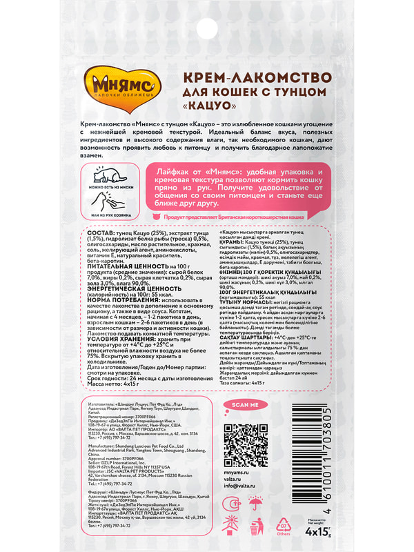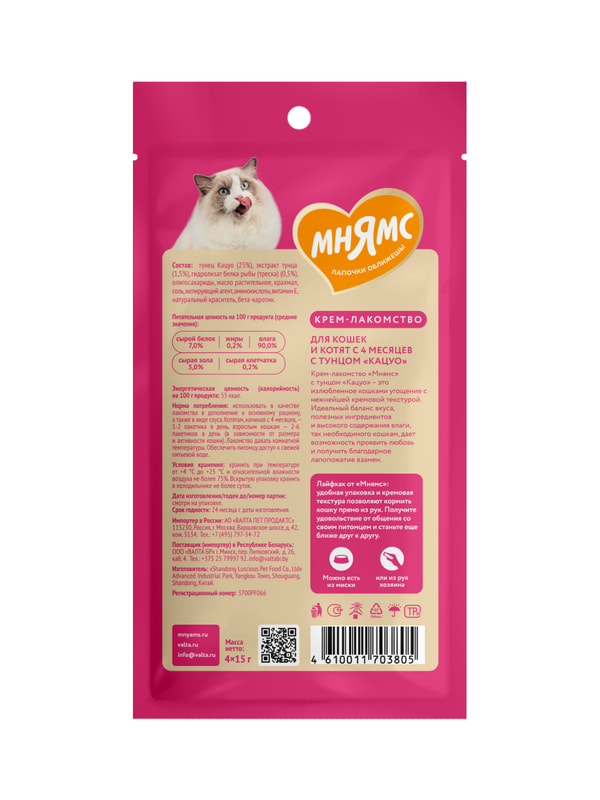 Крем-лакомство «Мнямс» с тунцом – это изысканное угощение с нежнейшей кремовой консистенцией. Утонченный вкус приводит кошек в восторг, а яркие эмоции довольных любимцев при кормлении с рук дарят хозяевам ощущение полного счастья. Подается как порционное угощение, или добавляется в виде аппетитного соуса к основному рациону для обогащения вкуса привычных блюд. Изготовлено по новейшей японской технологии и соответствует мировым стандартам качества.