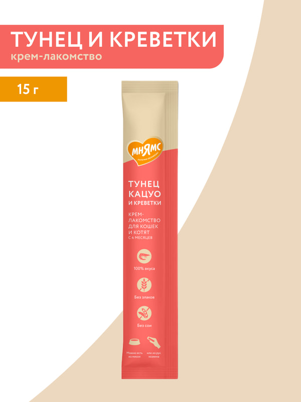 Повседневные Мнямс Крем-лакомство Мнямс для кошек с тунцом Кацуо и креветками 15 г