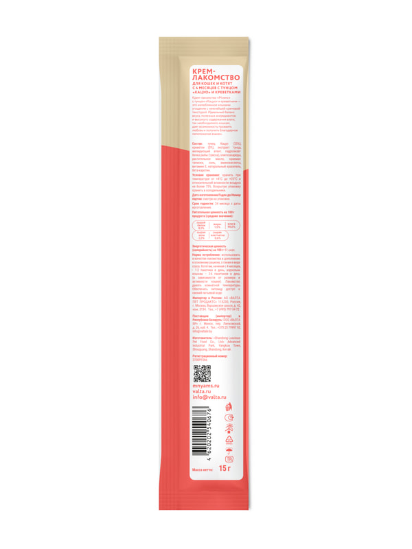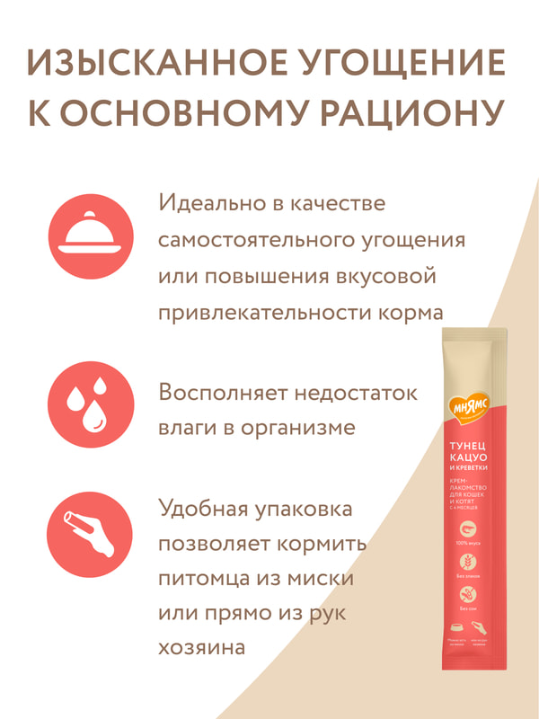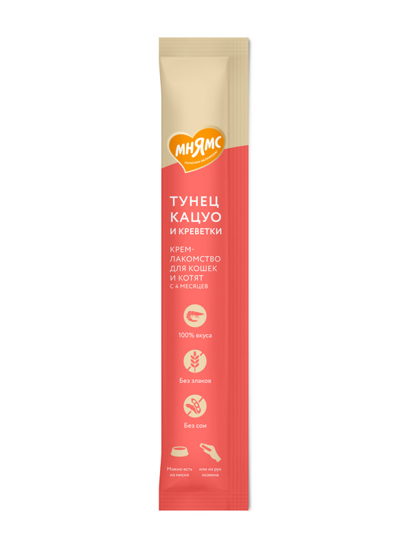 Крем-лакомство «Мнямс» с тунцом "Кацуо" и креветками – это излюбленное кошками угощение с нежнейшей кремовой текстурой. Идеальный баланс вкуса, полезных ингредиентов и высокого содержания влаги, так необходимого кошкам, дает возможность проявить любовь и получить благодарное лапопожатие взамен.
