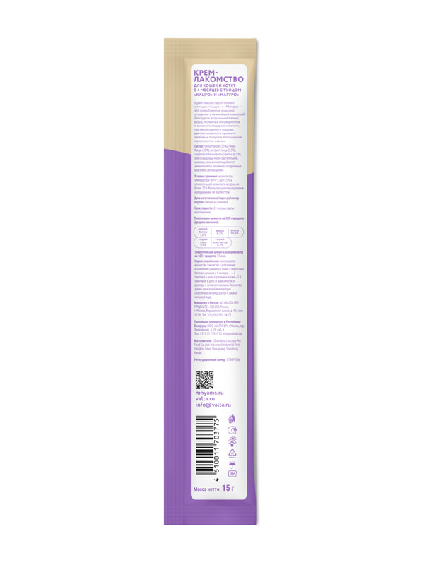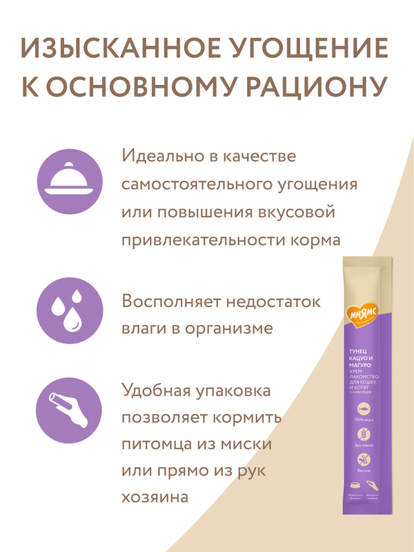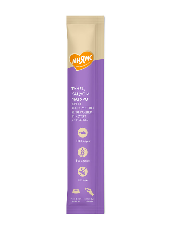 Крем-лакомство «Мнямс» с тунцом – это изысканное угощение с нежнейшей кремовой консистенцией. Утонченный вкус приводит кошек в восторг, а яркие эмоции довольных любимцев при кормлении с рук дарят хозяевам ощущение полного счастья. Подается как порционное угощение, или добавляется в виде аппетитного соуса к основному рациону для обогащения вкуса привычных блюд. Изготовлено по новейшей японской технологии и соответствует мировым стандартам качества.