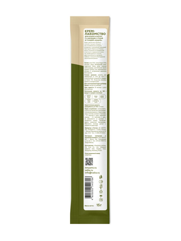 Состав: утка (15%), тунец Кацуо (15%), экстракт тунца, желирующий агент, гидролизат белка рыбы, олигосахариды, растительное масло, крахмал тапиоки, соль, аминокислоты, витамин Е, натуральный краситель, бета-каротин.
