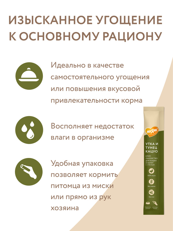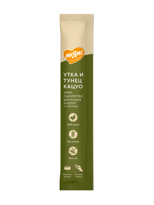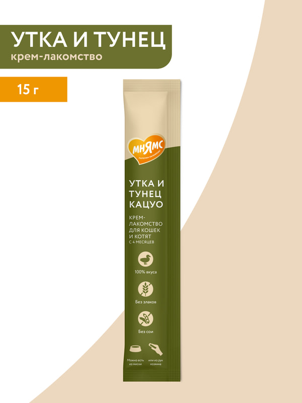Крем-лакомство «Мнямс» с уткой и тунцом "Кацуо" – это излюбленное кошками угощение с нежнейшей кремовой текстурой.