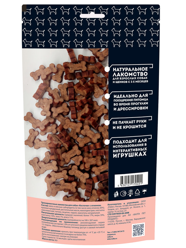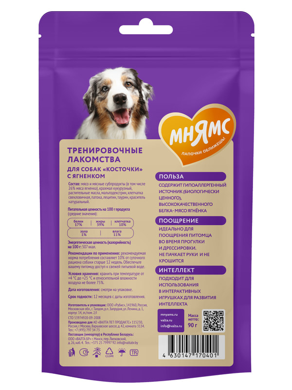 Мнямс тренировочные лакомства "Косточки" с ягненком для взрослых собак и щенков старше 3-х месяцев предназначены для поощрения питомца во время прогулки и дрессировки. Благодаря высокой вкусовой привлекательности, низкой калорийности и оптимальному размеру каждого лакомства идеальны для собак любых пород. Не пачкают руки и не крошатся, подходят для использования в интерактивных игрушках.