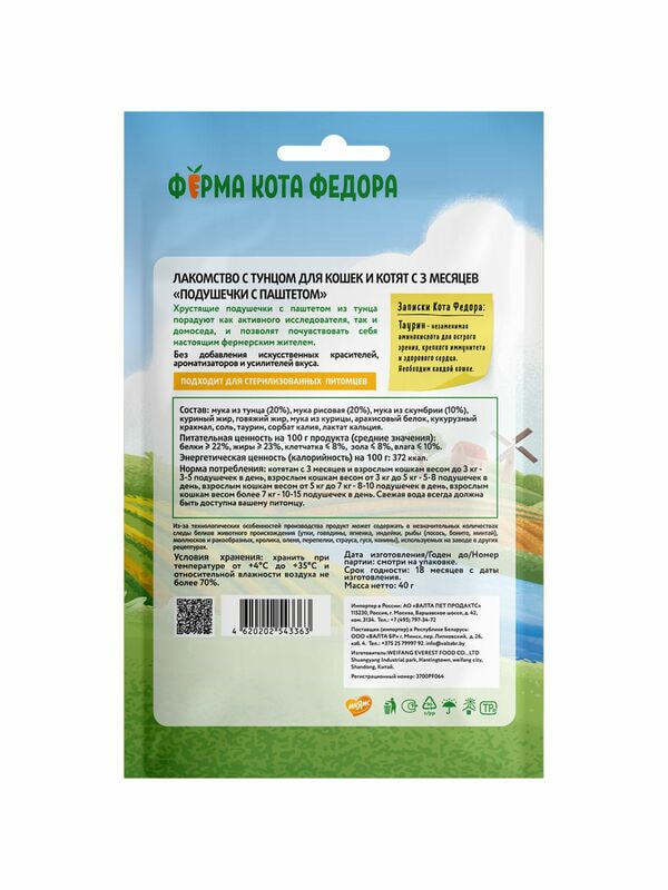 Повседневные Ферма кота Фёдора Лакомство Ферма кота Федора хрустящие подушечки для кошек и котят с паштетом из тунца 40 г