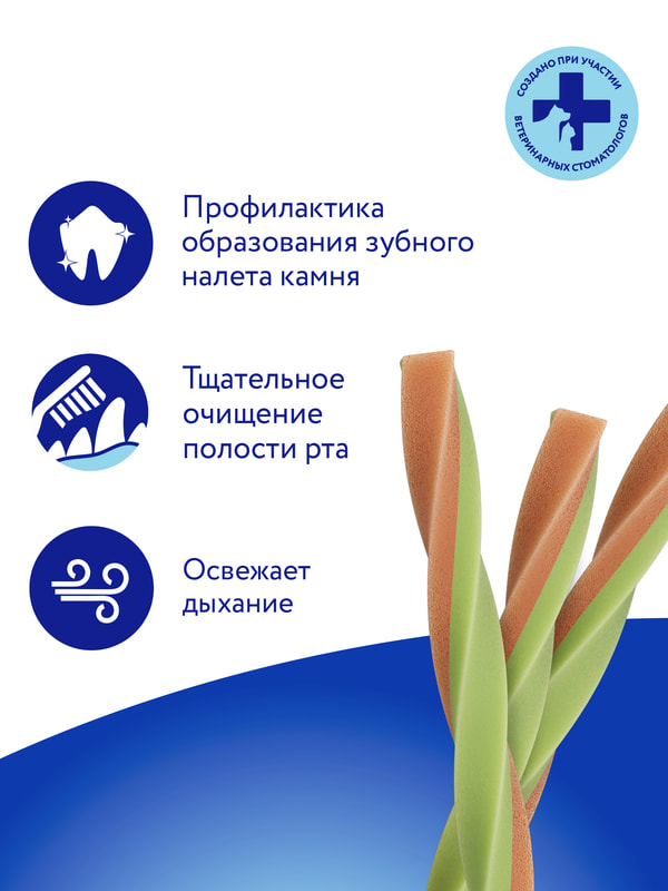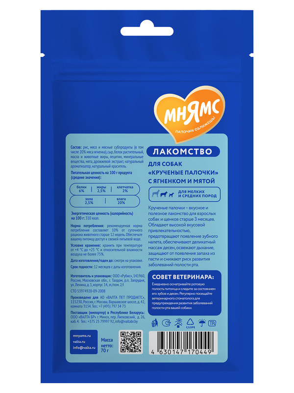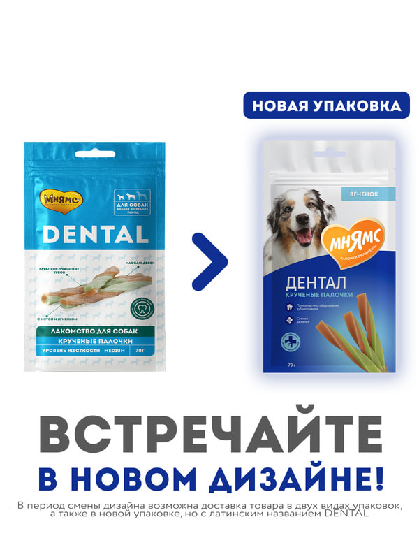 Мнямс ДЕНТАЛ "Крученые палочки" с ягненком и мятой – вкусное и полезное лакомство для взрослых собак и щенков старше 3-х месяцев. Обладают высокой вкусовой привлекательностью, предотвращают появление зубного налета, обеспечивают деликатный массаж десен, освежают дыхание, защищают от появления запаха из пасти и снижают риск развития заболеваний полости рта.
