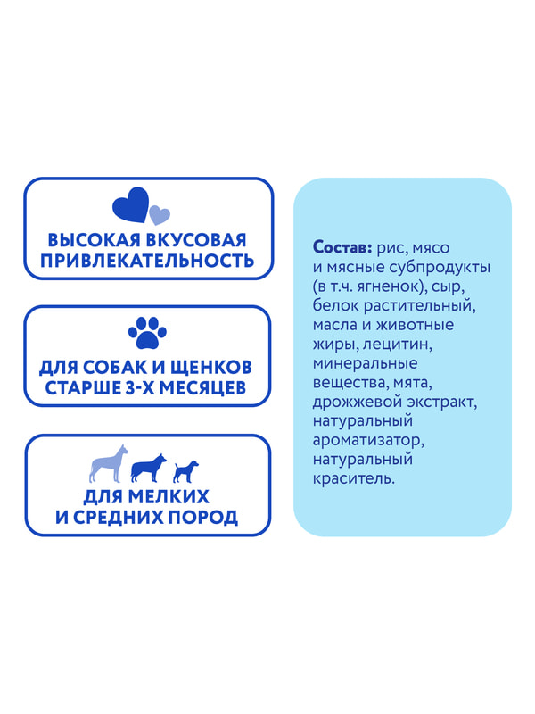 Ингредиенты: рис, мясо и мясные субпродукты (в том числе ягненок), сыр, белок растительный, масла и животные жиры, лецитин, минеральные вещества, мята, дрожжевой экстракт, натуральный ароматизатор, натуральный краситель.