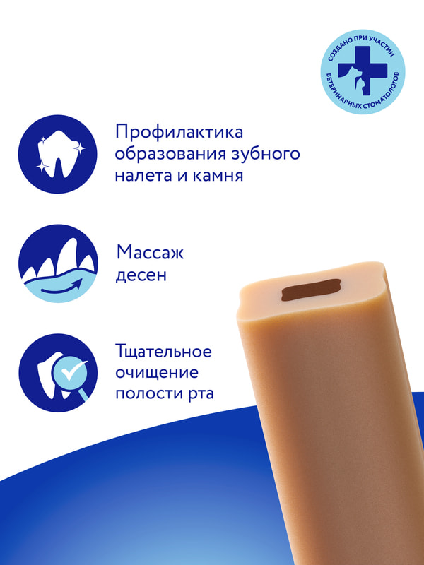 Мнямс ДЕНТАЛ "Зубной снек"с говядиной – вкусное и полезное лакомство для взрослых собак крупных пород и щенков крупных пород старше 3-х месяцев. Обладает высокой вкусовой привлекательностью и прекрасной поедаемостью. Благодаря особой форме гарантирует тщательное очищение даже самых труднодоступных мест полости рта, предотвращает появление налета и обеспечивает профилактику появления зубного камня, обладает антибактериальным и освежающим действием, деликатно массирует десны.