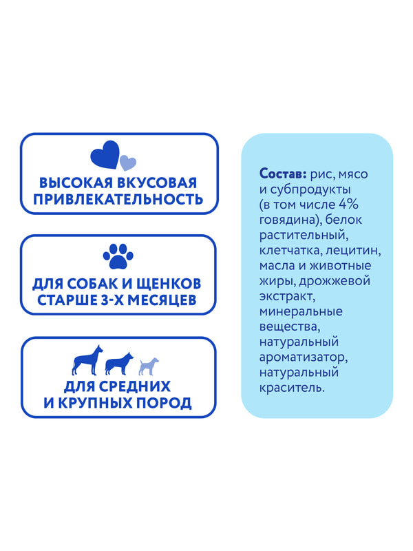 Ингредиенты: рис, мясо и субпродукты (в т.ч. говядина 4%), белок растительный, клетчатка, лецитин, масла и животные жиры, дрожжевой экстракт, минеральные вещества, натуральный ароматизатор, натуральный краситель.