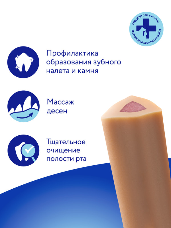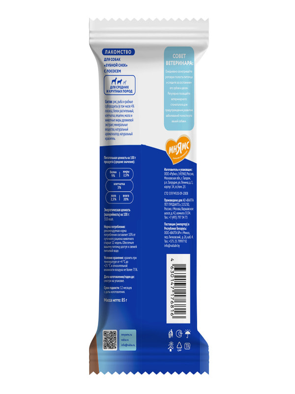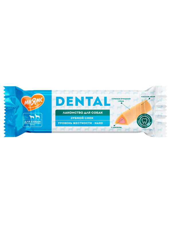 Мнямс ДЕНТАЛ "Зубной снек"с лососем – вкусное и полезное лакомство для взрослых собак крупных пород и щенков крупных пород старше 3-х месяцев. Обладает высокой вкусовой привлекательностью и прекрасной поедаемостью. Благодаря особой форме гарантирует тщательное очищение даже самых труднодоступных мест полости рта, предотвращает появление налета и обеспечивает профилактику появления зубного камня, обладает антибактериальным и освежающим действием, деликатно массирует десны.