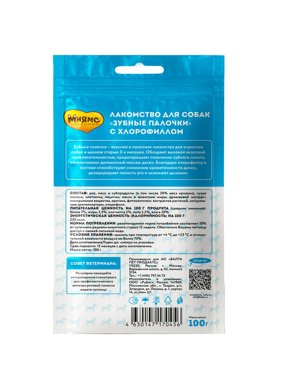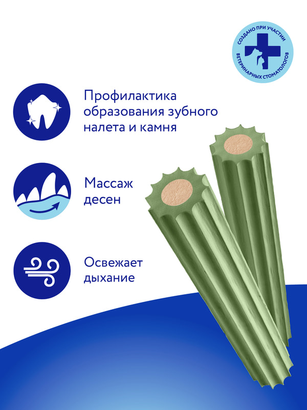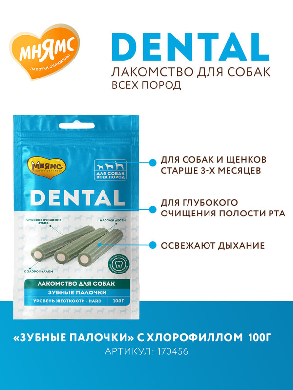 Мнямс ДЕНТАЛ "Зубные палочки" с хлорофиллом – вкусное и полезное лакомство для взрослых собак и щенков старше 3-х месяцев. Обладают высокой вкусовой привлекательностью, предотвращают появление зубного налета, обеспечивают деликатный массаж десен. Благодаря хлорофиллу в составе, способствуют снижению кровоточивости десен, дезодорирует полость рта и освежают дыхание.