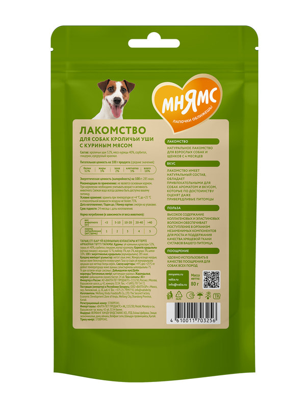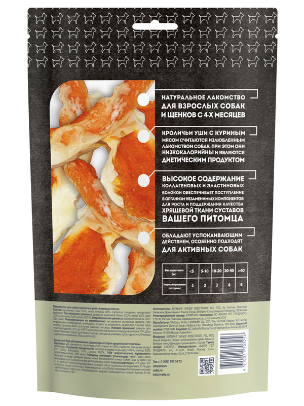 Ингредиенты: Кроличьи уши 52%, курица 40%, сорбитол, глицерин, кукурузный крахмал.