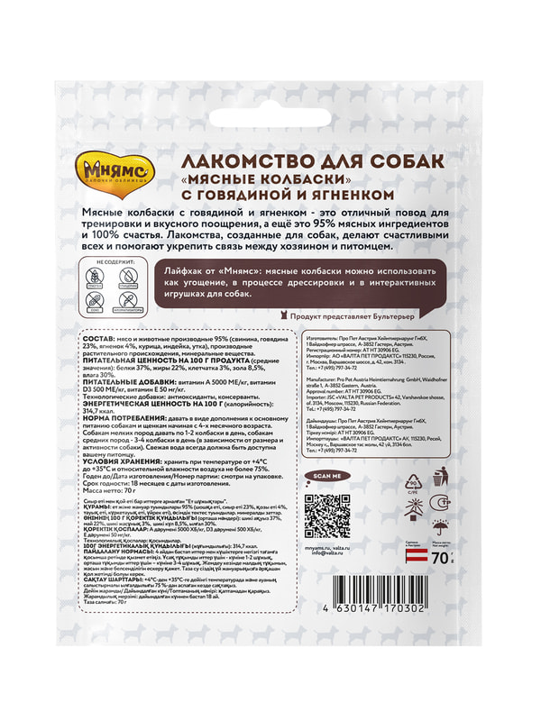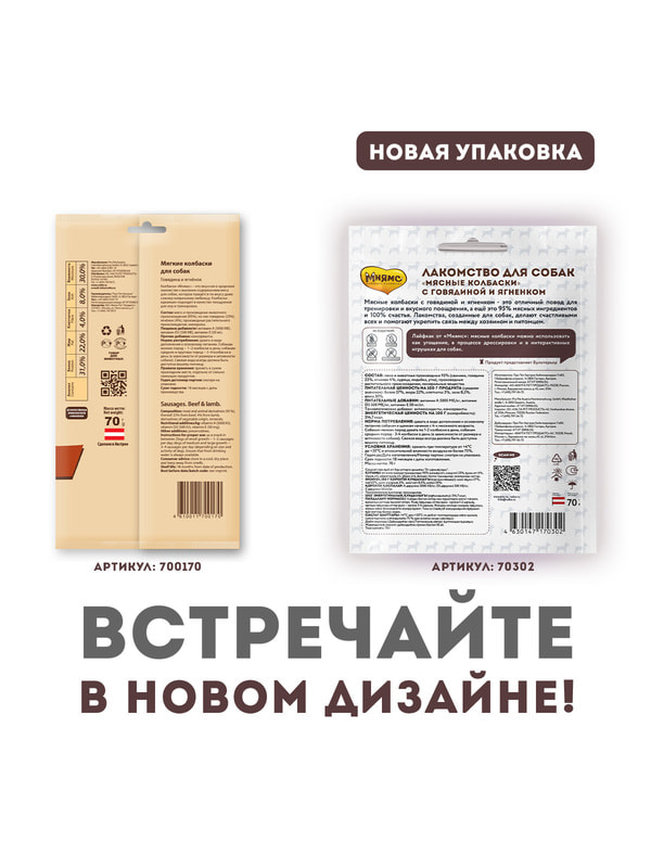 Мясные колбаски с говядиной и ягненком - это отличный повод для тренировки и вкусного поощрения, а ещё это 95% мясных ингредиентов и 100% счастья. Лакомства, созданные для собак, делают счастливыми всех и помогают укрепить связь между хозяином и питомцем.