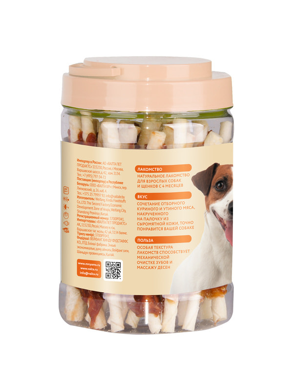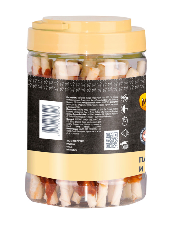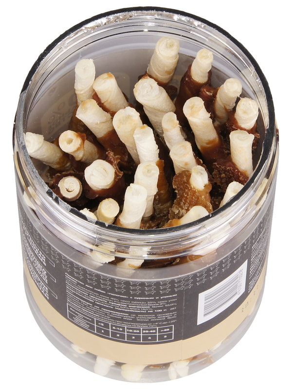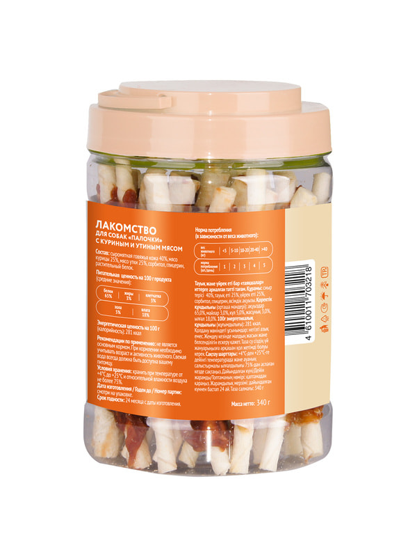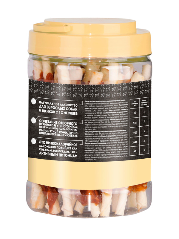 Ингредиенты: сыромятная говяжья кожа 40%, курица 25%, утка 25%, сорбитол, глицерин, растительный белок.