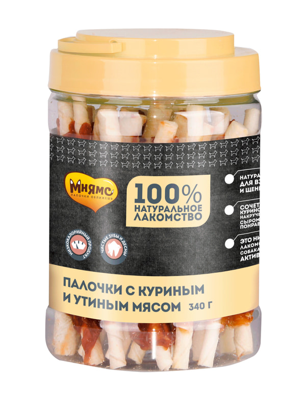 Палочки с куриным и утиным мясом "Мнямс" - это оригинальное жевательное лакомство, которое удовлетворяет природный жевательный инстинкт собаки. Вкусное и здоровое угощение идеально подходит в качестве поощрения для игр и тренировок.